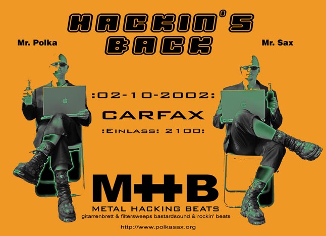 mr.polka & mr.saxHACKIN's BACK- metal - hacking - beats -[gittarrenbrett&filtersweep bastardsound&rockin'beats]02.10.2002 CARFAX /Memmingen [R.I.P.] Im Dickenreis 2, 87700 Memmingen, A7 Ausfahrt Memmingen Süd, links Richtung Woringen (800 m) [Anfahrtsskizze] |